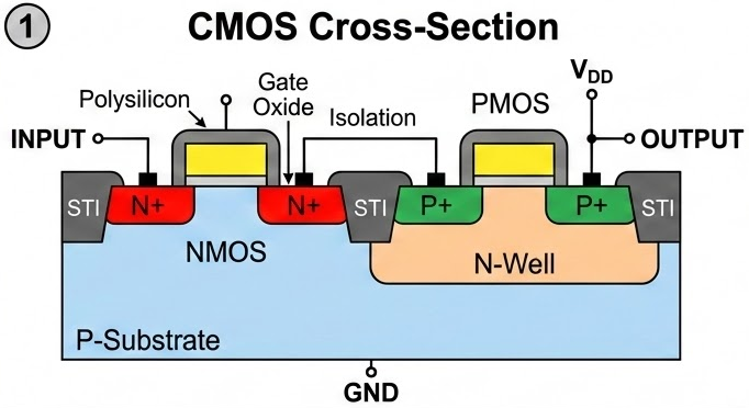 CMOS 구조 내부에서 의도치 않게 형성된 기생 소자(Parasitic BJT)들이 서로 연결되어, 과 접지(GND) 사이에 거대한 전류 통로가 생겨버리는 현상입니다. 한 번 켜지면 전원을 끄기 전까지 멈추지 않고 전류가 흐르기 때문에 '래치(Latch, 걸쇠)'라는 이름이 붙었습니다.