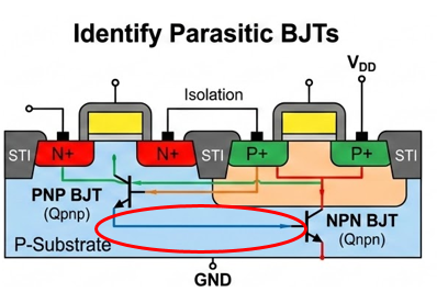 이미지 1, 2번에서 보시는 것처럼, CMOS는 NMOS와 PMOS를 만들기 위해 P형 기판과 N-well을 혼합해서 사용합니다. 이 과정에서 설계자가 의도하지 않은 PNP 트랜지스터와 NPN 트랜지스터가 만들어집니다.