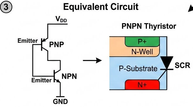시작은 기판이나 Well에 전류가 흘러 전압 강하가 발생합니다. 이 전압 차가 BJT의 문턱 전압(약 0.7V)을 넘으면 하나의 BJT가 켜집니다. 켜진 BJT가 전류를 흘리면, 그 전류가 다시 상대방 BJT의 베이스를 자극하여 켭니다. 두 BJT가 서로를 계속 켜주는 Positive Feedback 상태에 빠지며, 전원과 접지가 직접 연결된 것처럼 엄청난 전류가 흐르게 됩니다.